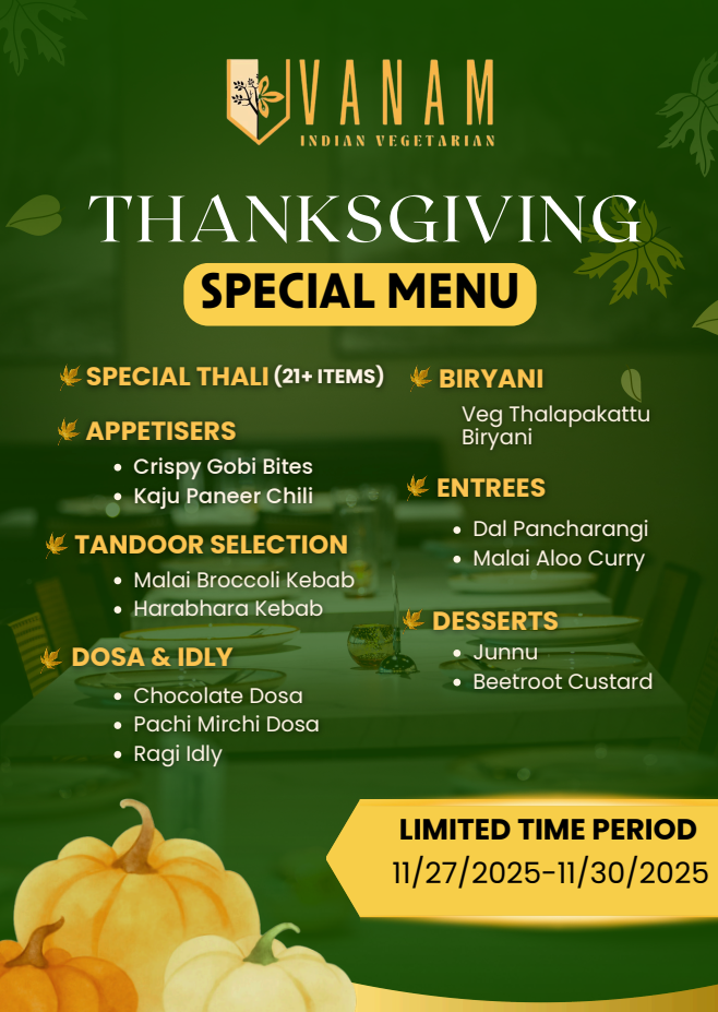 At Vanam, we believe in pure, plant-based indulgence, showcasing seasonal ingredients, regional spices, and time-honored recipes. Every dish reflects our passion for sustainable, flavorful, and nourishing food.